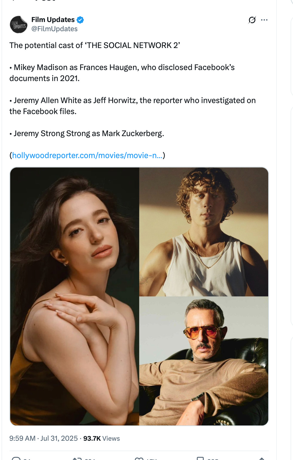 But speaking of Fincher, The Social Network 2 is coming, though it will be written by Aaron Sorkin, who is, I believe, very much inside the bubble.