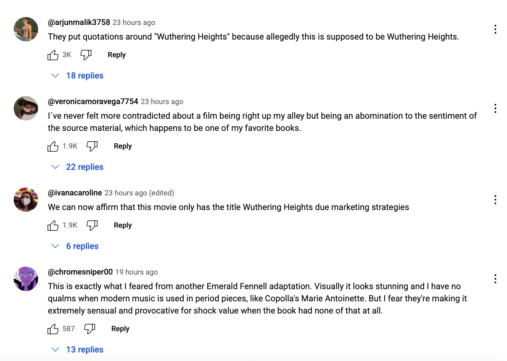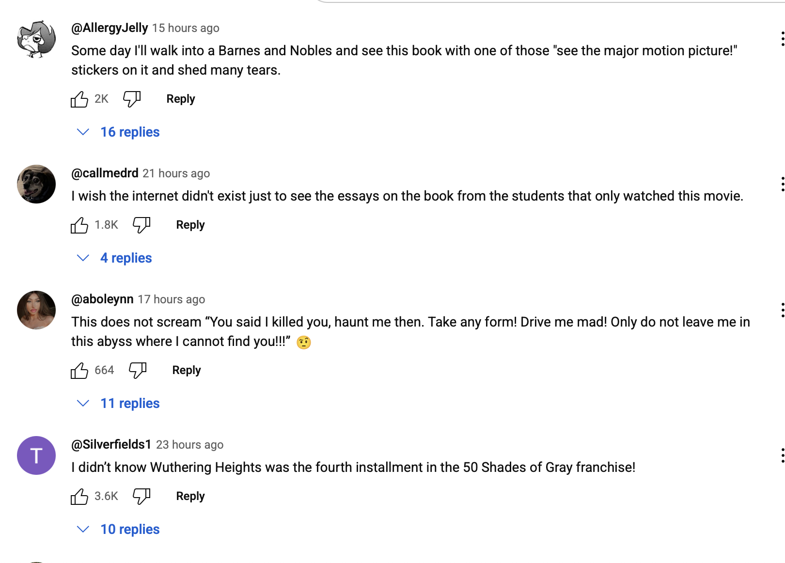 Why tease it this early? Who knows. Maybe to get the scandal and controversy out of the way. Maybe to drive viral attention to it. Not sure. The takes range from Margot Robbie is too old to play Cathey who dies at the age of 19 in the book, or that Heathcliff is not white in the book, or that it’s overt sexuality when it should not be.