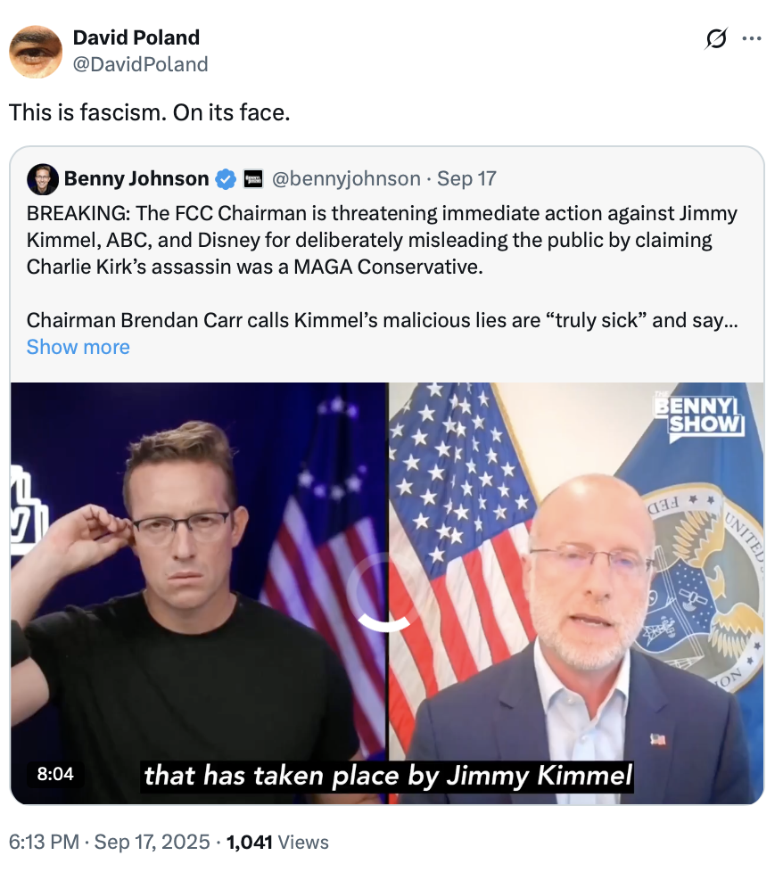 Unfortunately for Trump, as usual, he overplayed his hand. Power does strange things to people, no matter their politics. Most people can’t help but flip the switch. But in this case, he stepped on a rake because he saved Jimmy Kimmel and the network from the embarrassment of failure. Now they get to cosplay fascism yet again. The truth? They could have fought for Kimmel if he had been profitable for them.