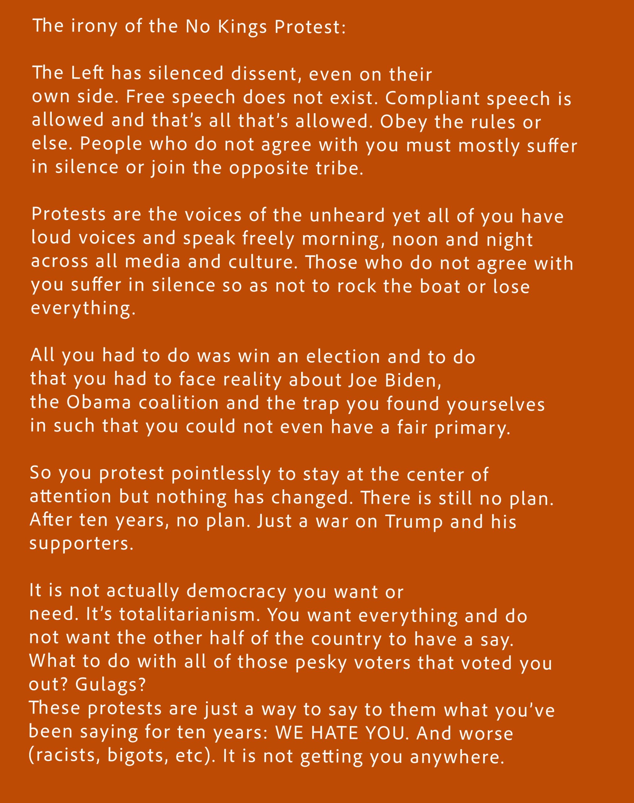 Right now, people on the Left have decided that we live in an oppressor/oppressed world and that your protection and worth is defined by things like skin color and gender identity. If you are considered “marginalized” and you comply with their strict doctrine, they’ll leave you alone. If you dare to express your opinion, they will attack you with every weapon they have at their disposal. They will accuse you of everything they can to hurt you. In the old days it was “fat, ugly and old.” Every so often those insults still come out, but for the most part, their insults are oppressor/oppressed based. I am a white woman and non-compliant and push back and voted for Trump — in all of the ways they define enemies of their utopia, I am it.