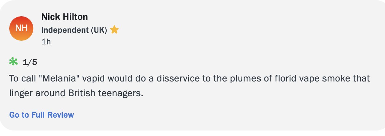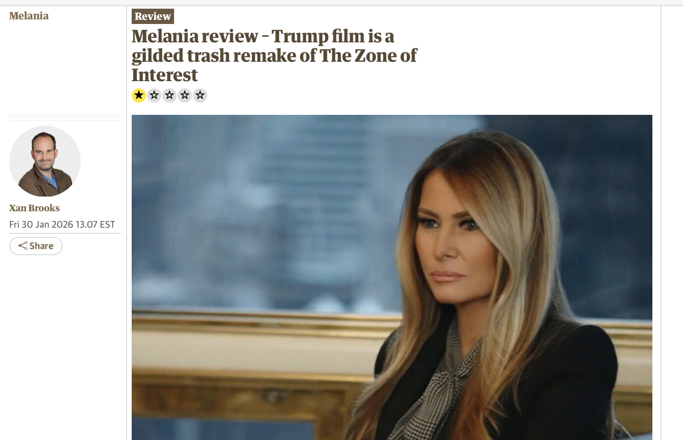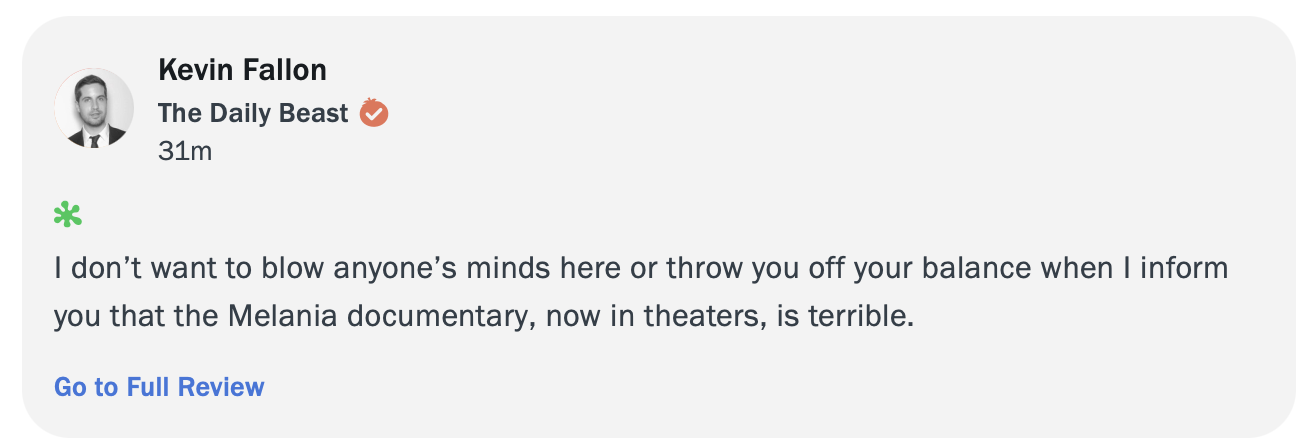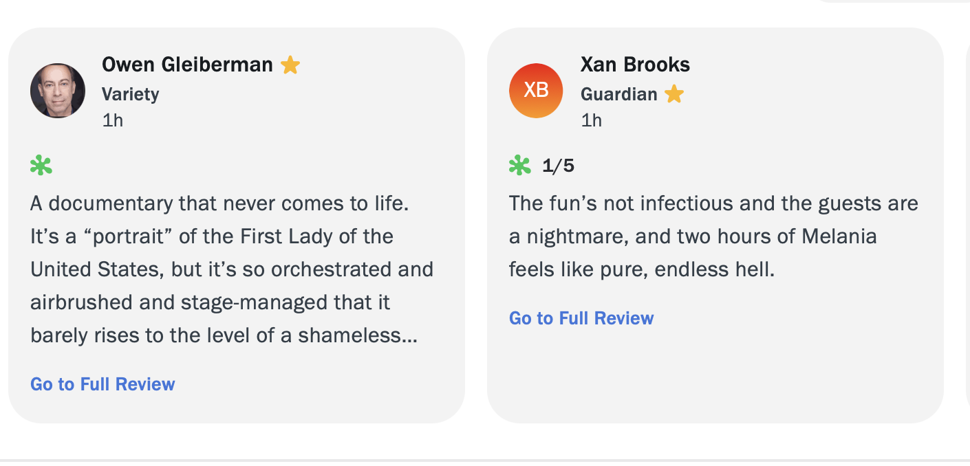 I wondered why the audience review score for One Battle After Another was stuck at 85 and still is to this day, never budging from that spot. I always wondered if they capped it to prevent “review bombing” by “racists.” I’ll never know the answer to that, but what I do know is that they’d never go that far to stop “critics” review-bombing Melania, which is what they’ve done, predictably.