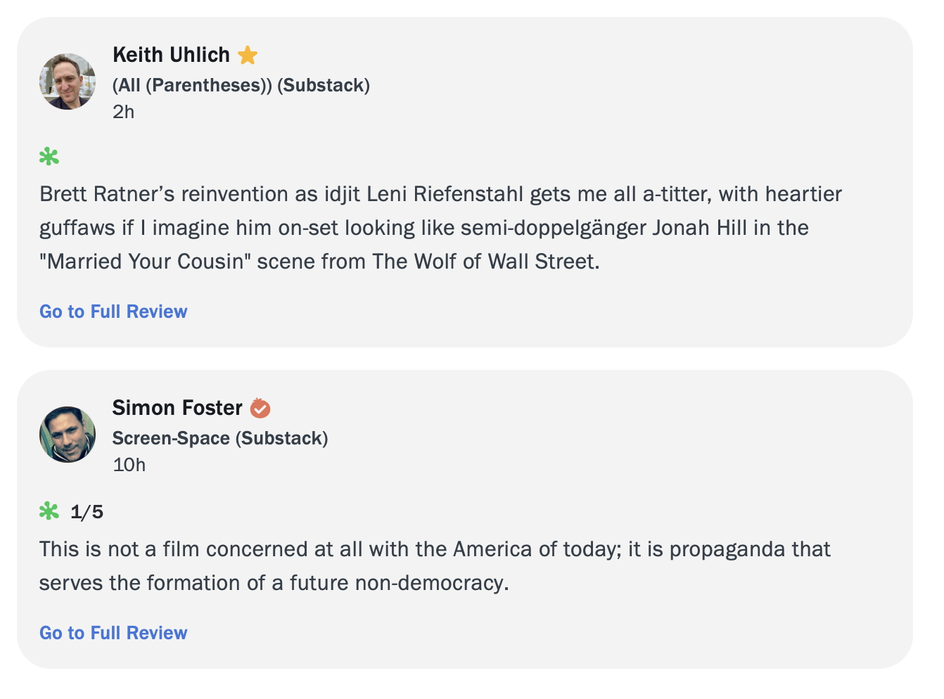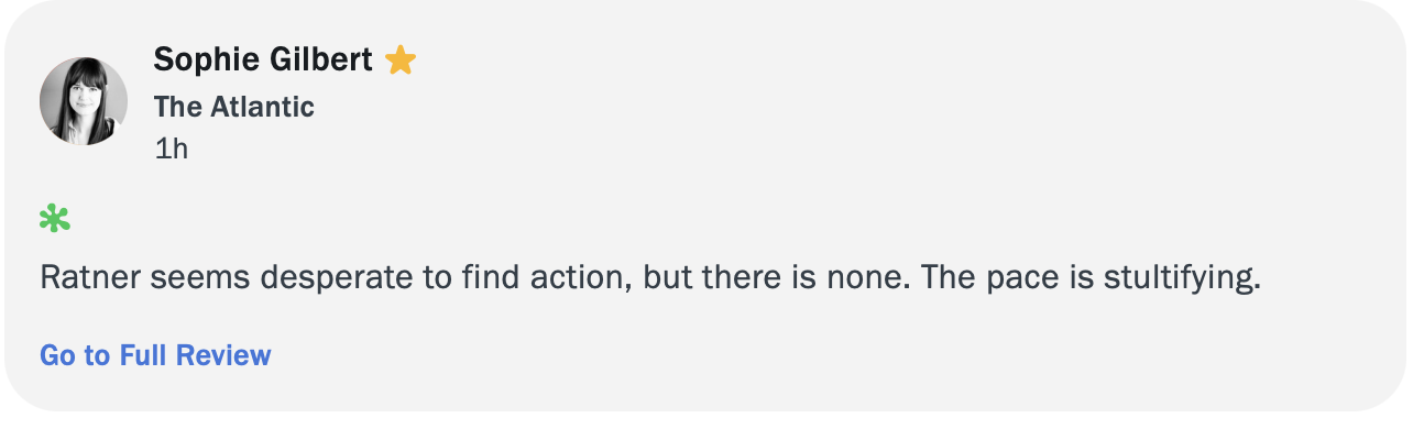 At least there is one decent review in a sea of caterwauling activists posing as journalists. There is one writer who considered the film for what it was without using it as yet more ammo to fire at Trump in the decade-long war that has resulted only in Trump winning a second time. Lesson still not learned for those trapped inside the Doomsday Cult, least of all the “critics.”
