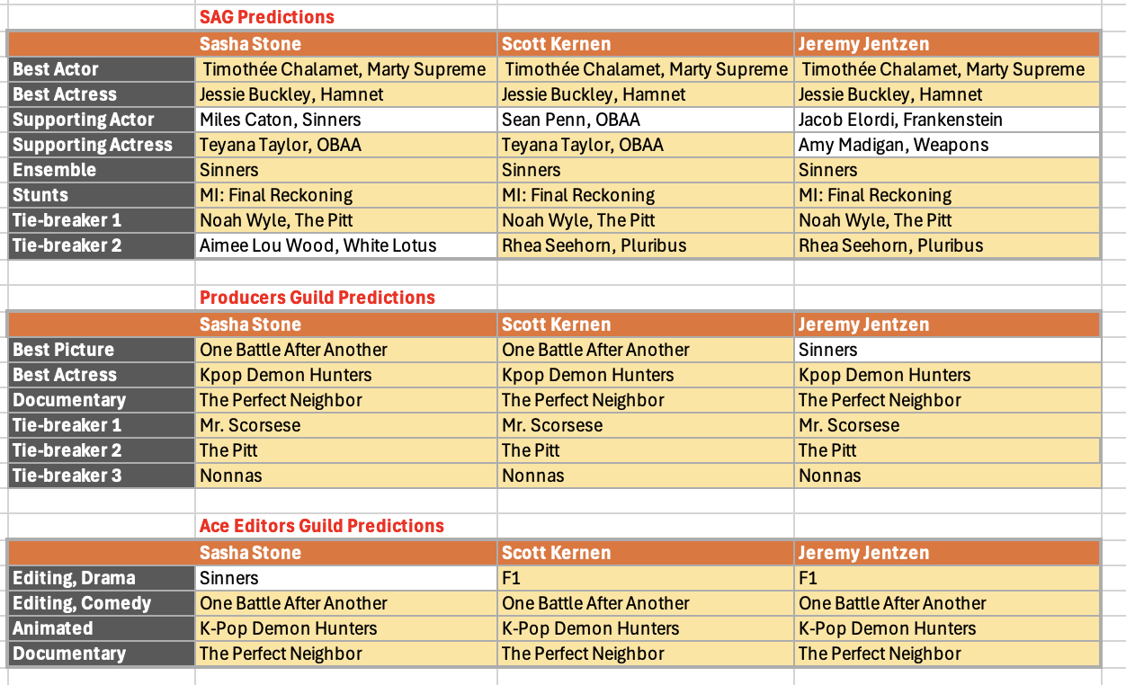 Three of the biggest guilds announce their awards this weekend. The ACE Awards for editing are on Friday, Feb 26 (tomorrow). The Producers Guild is Saturday, and the SAG Awards are Sunday. By the end of it, we will know if One Battle After Another is as projected — winning more precursor awards than Argo and Oppenheimer — the can’t-lose frontrunner, or if there is any wiggle room therein.